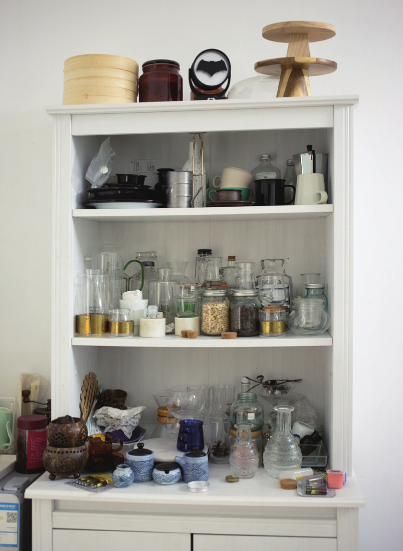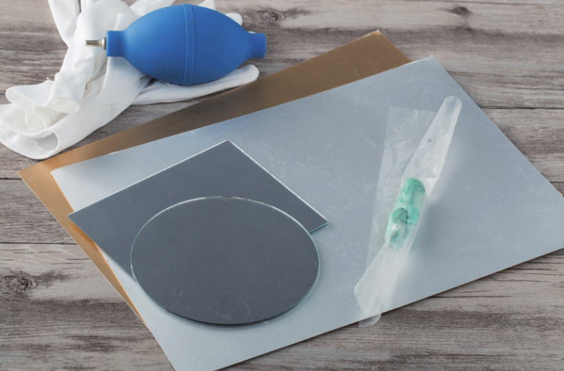 03 工作室里必备的银卡纸、镜子、固定食品的橡皮胶和清洁表面的气吹。
