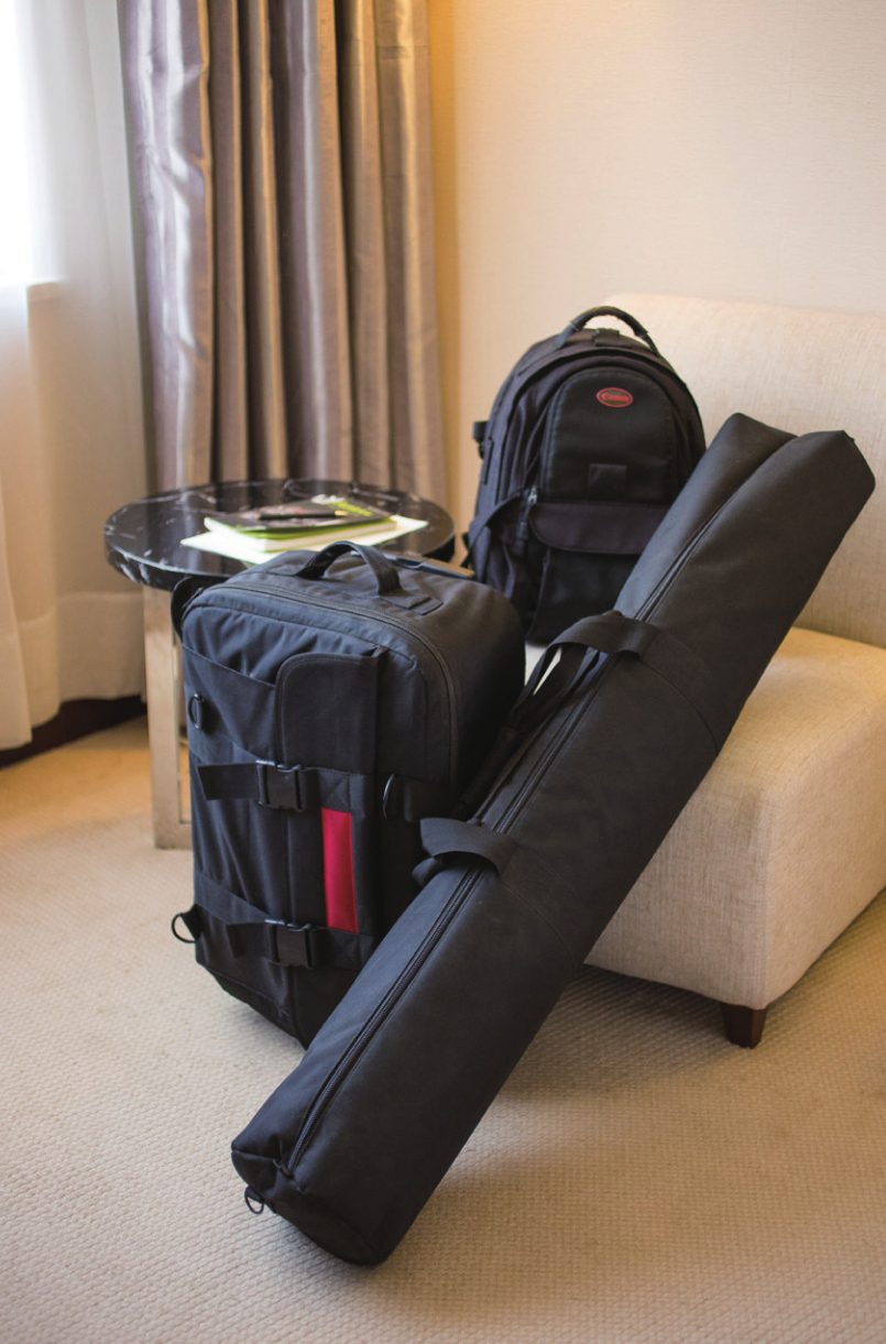 01 我外出拍摄常带的三大件:相机包(里面有两台相机和三支镜头)、灯架包和装灯的拉杆箱。