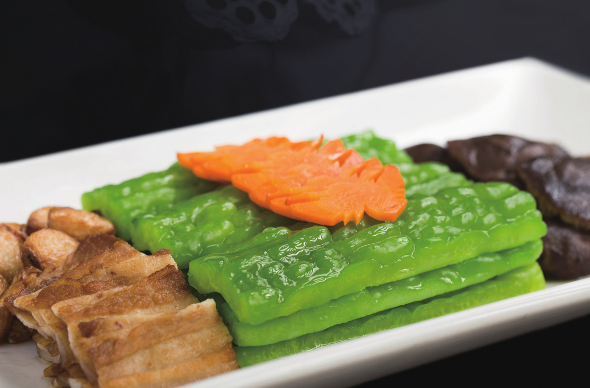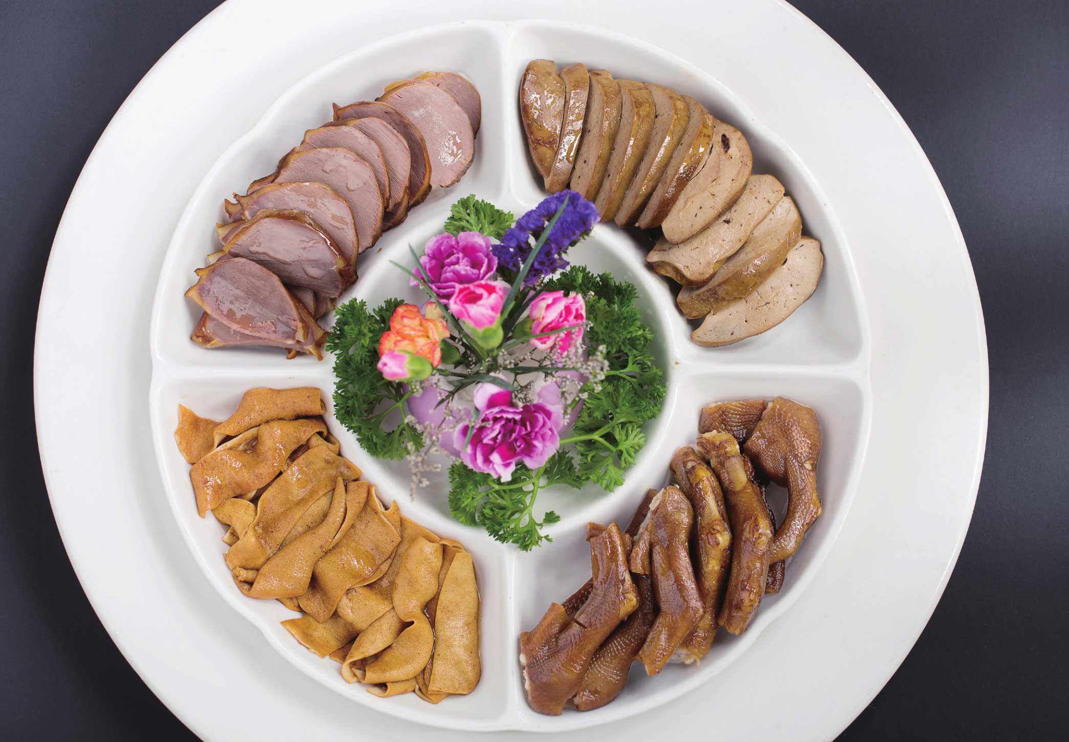 在这张黑色背景的卤水拼盘的图片里,我在背景处加了莲蓬,以丰富画面。
