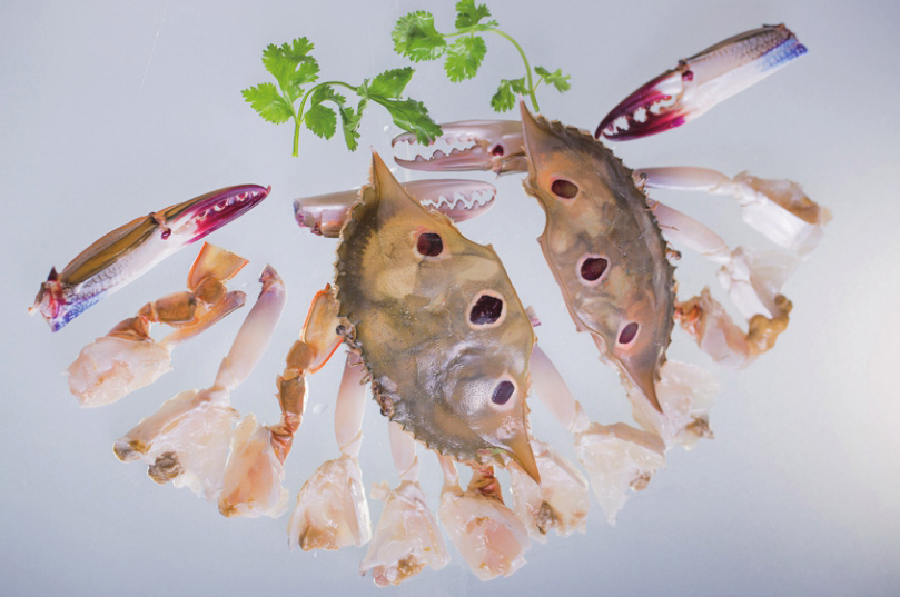 10 用柔光PVC半透明卡垫在底部,从透明玻璃桌台下打透光拍摄的三目蛴(食材)。