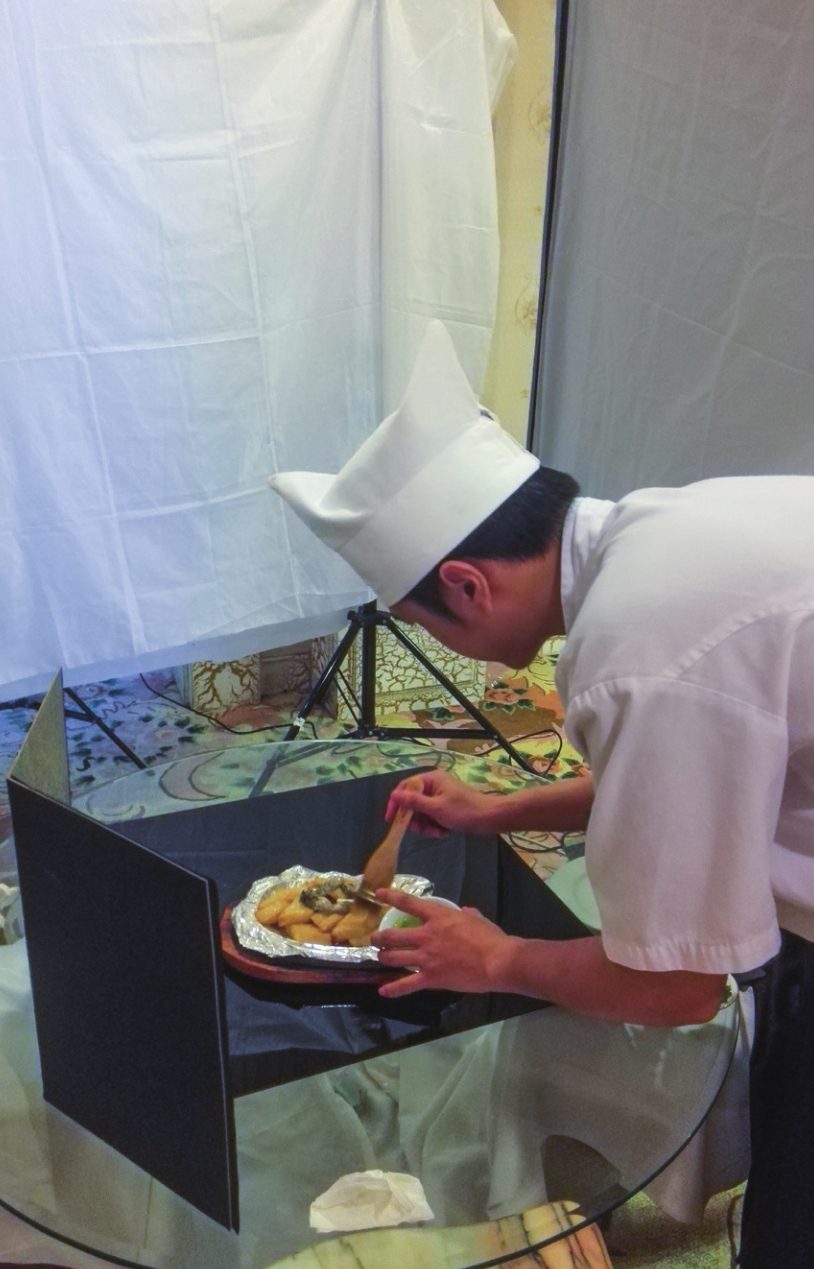 现场的布光场所不像摄影工作室那么便利,需要什么有什么,需要灵活变通,摄影台可能要使用餐厅或酒店现场的茶几或桌台。