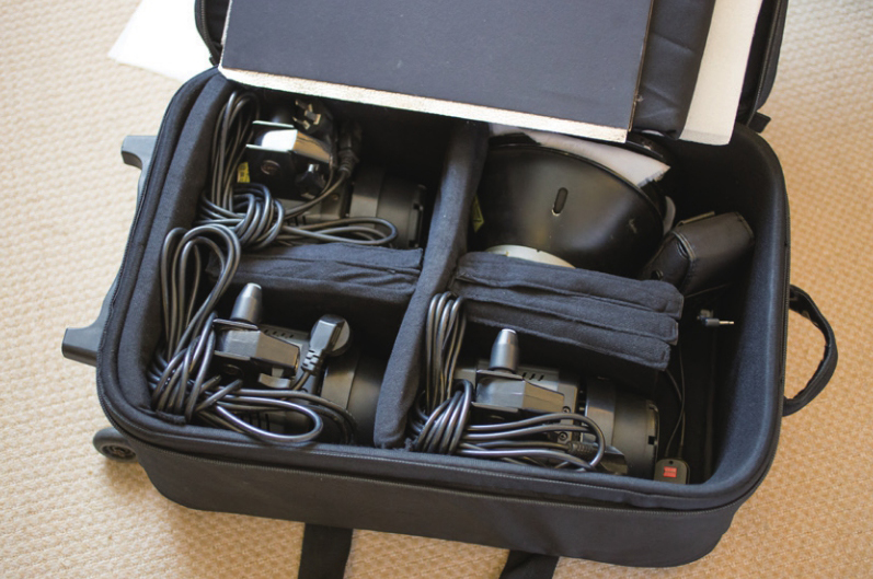 03 拉杆箱里是三盏闪光灯。三盏闪光灯是最基本、最有保障的数量——其实我经常用两盏闪光灯再加上金/银反光板就够了。
