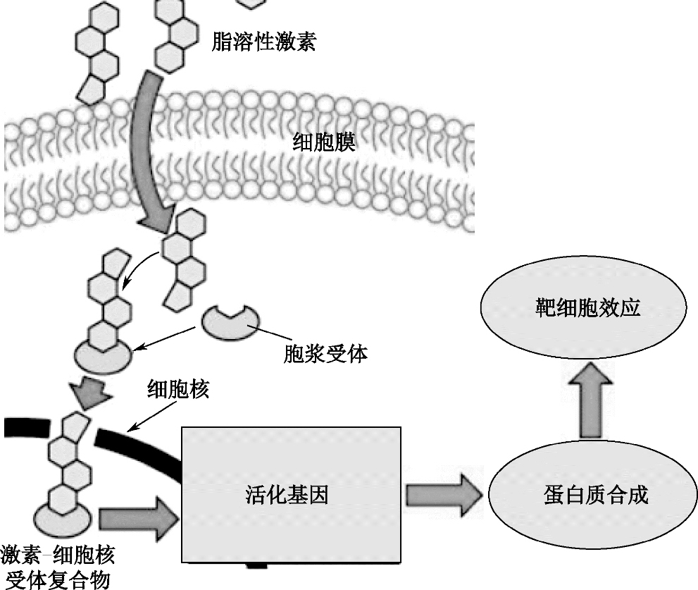 通常情况下,常见的内分泌分子包括细胞膜受体分子、胞浆受体分子、肽类激素分子、第二信使分子和类固醇激素分子和细胞核内受体分子等。在内分泌分子的作用过程中,肽类激素分子通过与靶细胞膜上的具有特殊结构的受体结合来激活腺苷酸环化酶系统,使细胞中的ATP在Mg 2+ 存在的前提下,可以转化为CAMP(第二信使),从而令肽类激素分子的信息传递给了第二信使分子;CAMP通过激活蛋白激酶来触发靶细胞的内部反应,如神经细胞传递信息过程中的电位变化、细胞膜的通透性变化及各种不同生物酶的作用,等等。类固醇激素分子的特点是个头小且具有脂溶性,它可以快速渗透细胞膜,与细胞中的胞浆受体结合生成一种特殊的复合物,在37℃的条件下会产生一种变构,使该复合物可以穿透细胞核的外膜,进一步与细胞核内的特定受体结合,转变为激素-细胞核受体复合物,然后在细胞核内部生成或抑制mRNA,进而对DNA的转录过程进行调节控制,并通过调节蛋白质的生成来控制靶细胞的生理反应,激素的基因表达机制如图2.7所示。