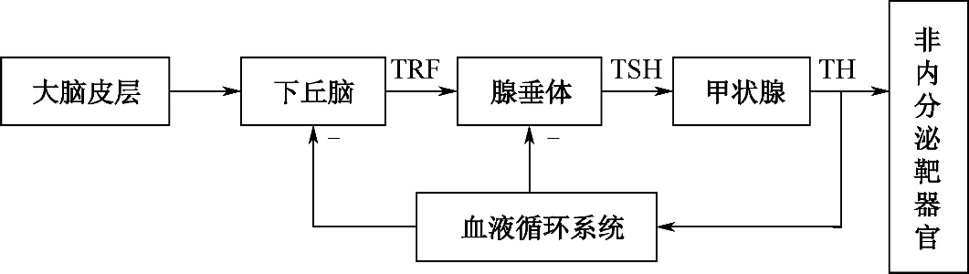 甲状腺调节系统的示意如图2.6所示,在大脑皮层中,有机体的神经细胞感知各种刺激信号,并将其根据生命活动需要整合传送到下丘脑组织,下丘脑组织根据接收到的信息分泌促甲状腺释放因子(TRF)给腺垂体,而腺垂体则根据TRF中的信息合成分泌促甲状腺激素(TSH)对机体组织进行调控,同时又通过体液循环系统将血液中的激素浓度状态反馈给下丘脑和腺垂体,使整个生理系统时刻处于一种动态的平衡状态中。