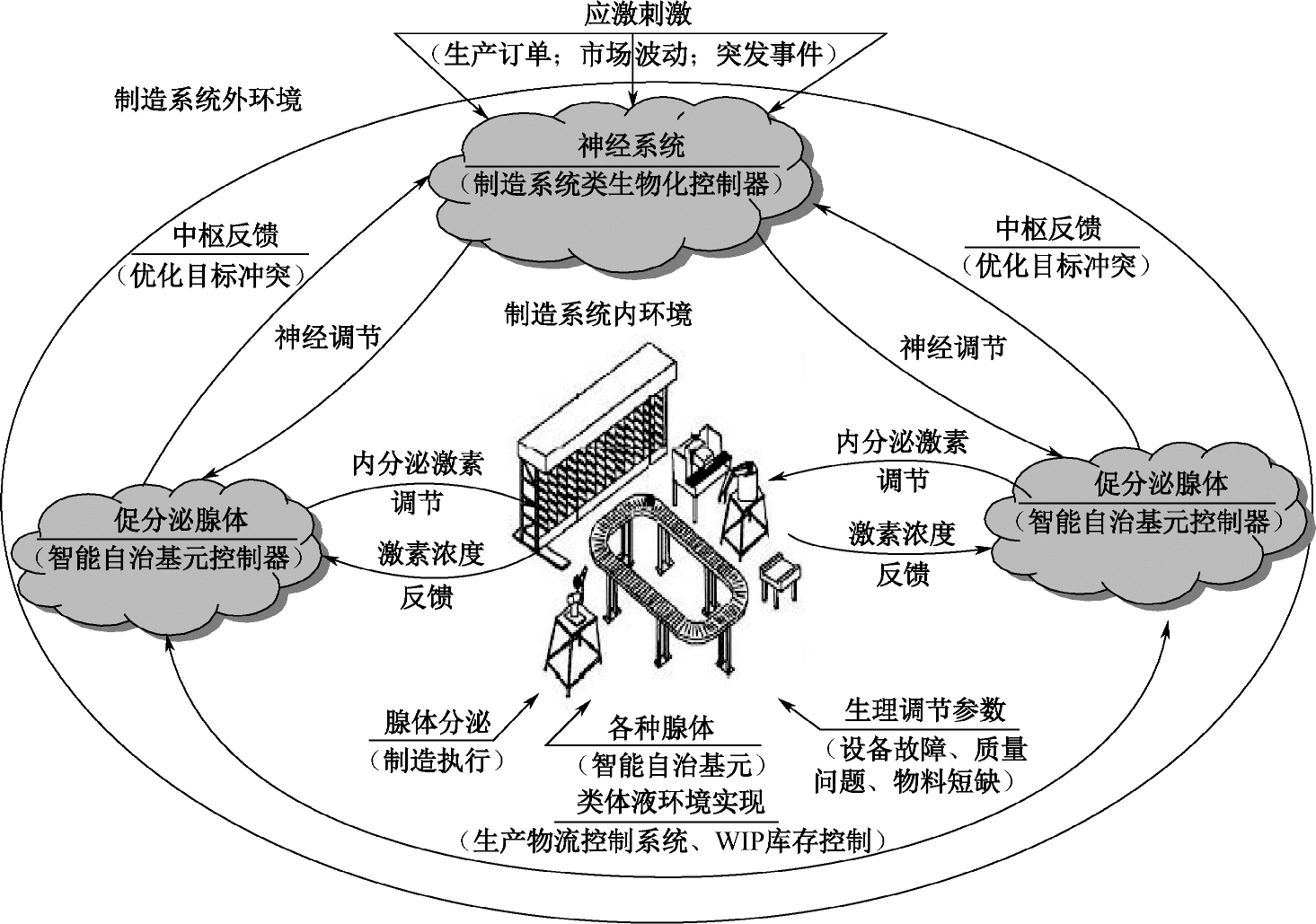 随着科技的发展,制造业的数字化、信息化趋势愈发明显,而生命科学也逐渐由单纯的科学研究转向了更全面的工程化应用,现代智能制造系统与生物系统之间的相似性也就愈发明显和突出,其相互之间的可借鉴性也变得更加具有可行性。从生物控制论的研究成果中我们可以发现,在生物系统中,其整体控制呈现一种递归特性,而其中各个不同层次的子系统又均具有自协调、自组织的特性,都可以灵活地根据周边环境的变化进行自我调节,使生物系统针对复杂多变的外部环境具有更多的灵活性和更强的适应性。比如,人体神经内分泌系统中的神经网络可以感知外界刺激,并产生兴奋或抑制某些生理活动的电信号,而后由内分泌系统接收这些信号,进而分泌出相应的激素物质,通过人体体液循环系统调节相应的器官或组织,从而协调控制人体某些生理活动。与此过程类似,借鉴生物自适应、自组织机制,现代智能制造系统应该能够根据市场波动和市场订单快速地克服各种意外干扰,高效地协调和控制自身各种生产活动,这样就可以有效提升企业核心竞争力,迅速适应动态多变的市场,并在激烈的市场竞争中占据一席之地。