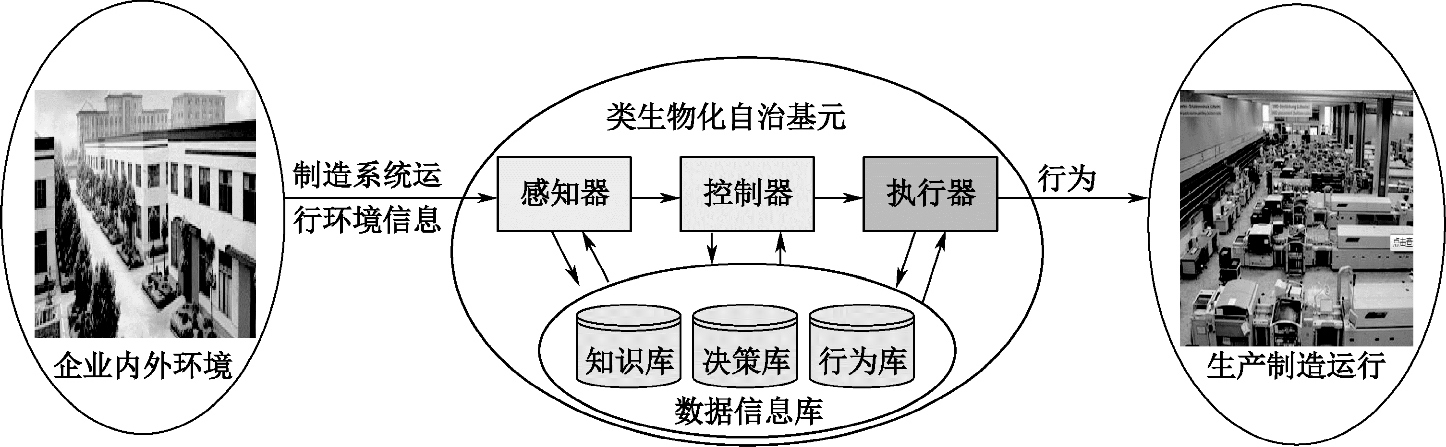 在现代智能制造系统中,其与生命有机系统类似,都必须通过不断地与外界进行物质、能量及信息等方面的交换来实现自身系统的正常运行与生存进化,以便更好地适应周围环境的改变。同样,作为类生物化智能制造系统的基本组成部分,智能自治基元也必须具备相应的功能,其通过感知器获取制造系统运行环境中的各种信息,并通过控制器结合数据信息库进行决策判断,选择合适的行为通过执行器输出。与生物有机体所处的自然环境一样,类生物化智能制造基元所处的制造环境也分为内环境和外环境两类,前者主要与智能基元的资源构成和内部控制结构有关,其表现形式是控制的实时性;而后者主要是与智能基元运作的周围环境中的变化相关,其表现形式是突发的波动性和控制的滞后性。类生物化智能自治基元由感知器来收集内外环境中的信息,控制并决定如何对内外环境中的各种变化进行平衡,由执行器来处理由内外环境变化所带来的制造过程中的复杂性。而现代智能制造系统的运行环境与市场需求、原料采购、新品开发和工艺更新等多种因素具有密切关系,而这些因素均存在着一定的不可控性,正是这些不可控的因素引起了制造系统运行环境的动态多变。如果现代智能制造系统的运行环境没有这些不可控因素,那么类生物化智能自治基元的控制和协调机制就会变得没有意义。基元的设计与构建就是为了寻求一种更合理、更快捷的途径来处理制造系统这些动态变化的基本构成。