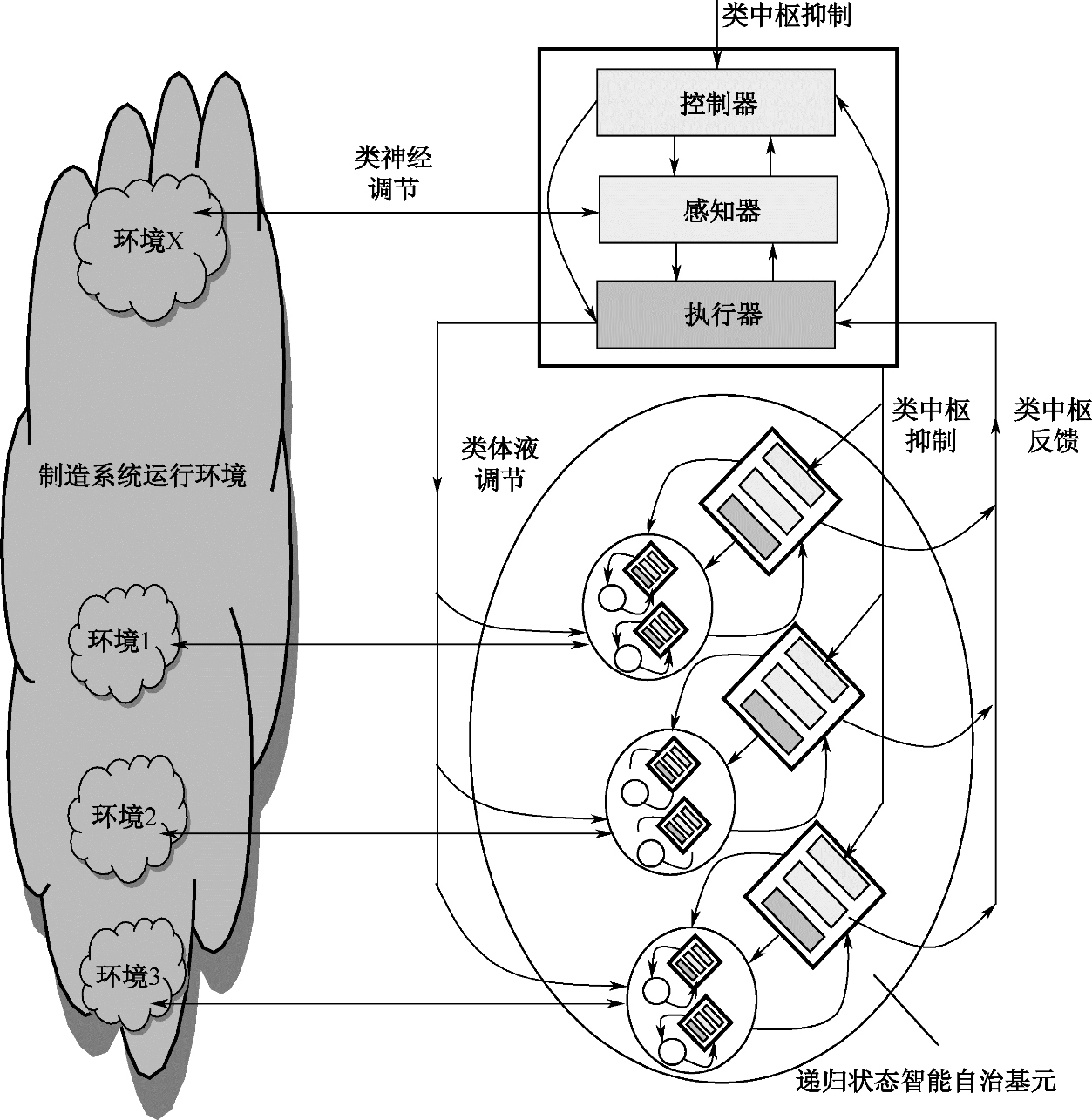 通过上述分析,我们不难看出,生物有机生命系统的生理活动和现代智能制造系统的生产活动在很多方面具有惊人的相似性。生命系统本身是一种动态的开放系统,由简单的细胞逐渐形成具有某种功能的组织,再由相近功能的组织形成各种专门的器官,然后不同作用的器官组合在一起形成了复杂的生命系统,这种结构天然具有高度的分布性特点。生命系统能够在大自然的各种不同环境中生存下来,说明其自身对于外界环境具有很强的自适应能力,同时还能够通过自身的某些协调控制机制实现生命体的进化与群体之间的协作。现代智能制造系统与生命系统类似,也是一种分布式的动态开放系统,制造系统的运行也需要与外界保持物质交换,维持内部各种设备和部门运作的协调性。现代智能制造系统往往是由很多具有自治特性的智能生产设备、AGV、各种机械传输装置、智能检测设备及制造资源等,通过合理的协调控制组合而成的一个庞大而复杂的典型的分布式系统,在这样一个系统中,可以借鉴生命系统中某些优秀的控制结构或协调机制。有研究者从生物控制论的角度解释了人体的一些自适应控制机制和规律,并对生物系统中的子系统与工程控制中的一些系统结构与功能进行了对比,发现在很多方面两者具有惊人的相似性,并且都可以通过相同或相似的组成部分来描述它们的控制机制。因此,在构建现代智能制造系统组织结构和控制协调模型时,尝试赋予制造系统的组成基元或智能子系统更多的生命有机体的特性,适当增强个体的自治能力,同时模拟人体神经内分泌系统的内部协调控制机制进行调控,不仅可以简化制造系统中各个功能单元之间复杂的耦合关系,还可以有效地对现代智能制造系统的智能性、自组织性、动态环境的自适应性和可重构性起到良好的促进作用。进入21世纪以后,现代智能制造系统不再是由一堆死板的、缺乏足够自治能力的生产设备和各种物料组成的,其发展方向必然是希望制造设备或智能生产基元能够独立地根据实时的加工情况,按照其所能感知到的环境状态和已设定的目标,自主地决策下一步的行为动作,更高效合理地完成各种制造任务。