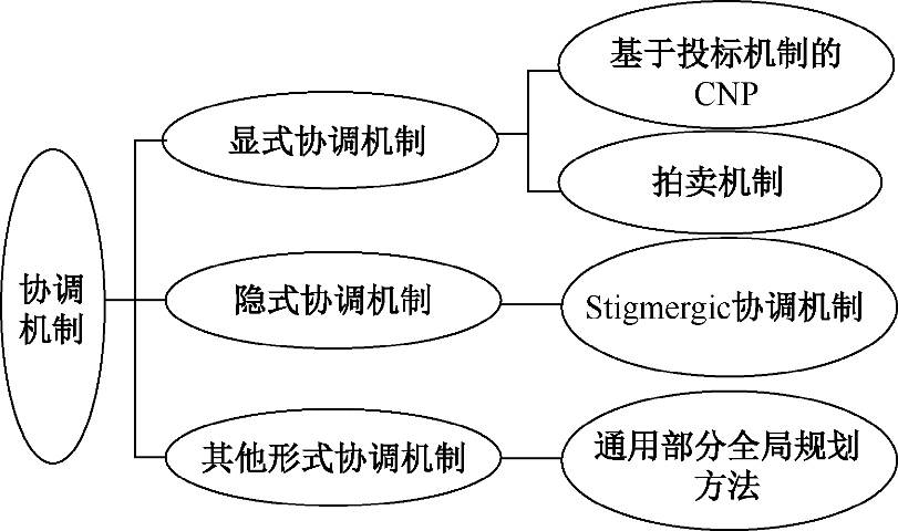 协调机制的分类如图1.7所示,它是按照制造控制系统中的控制实体进行协调活动时相互通信的方式。本节将协调机制研究文献中的常用方法进行了归纳和分类,其主要分为:显式协调机制(Explicit Coordination)、隐式协调机制(Implicit Coordination)和其他形式协调机制。