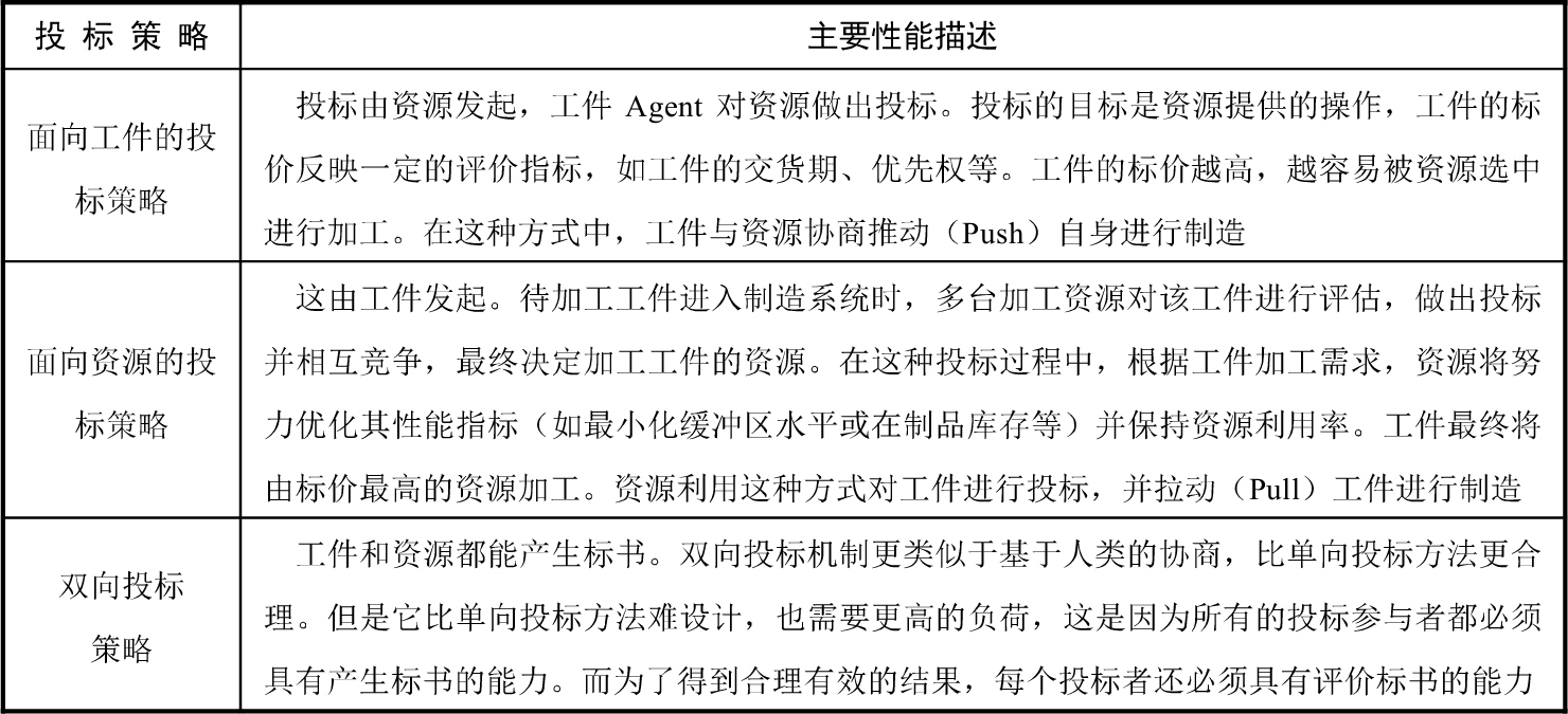 CNP运行的基础和核心就是投标机制,其在制造系统调度领域中常用的投标策略主要分为面向工件的投标策略、面向资源的投标策略,以及面向工件和资源的双向投标策略,其主要特征见表1.2。