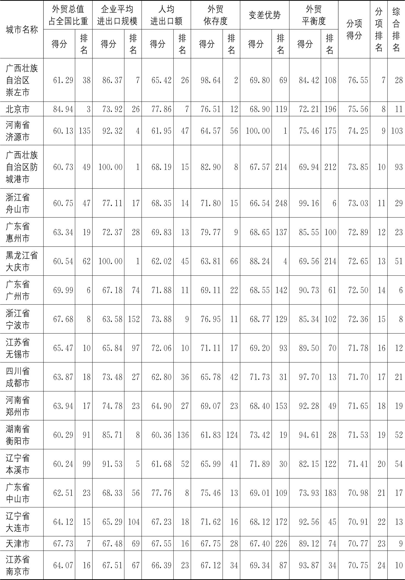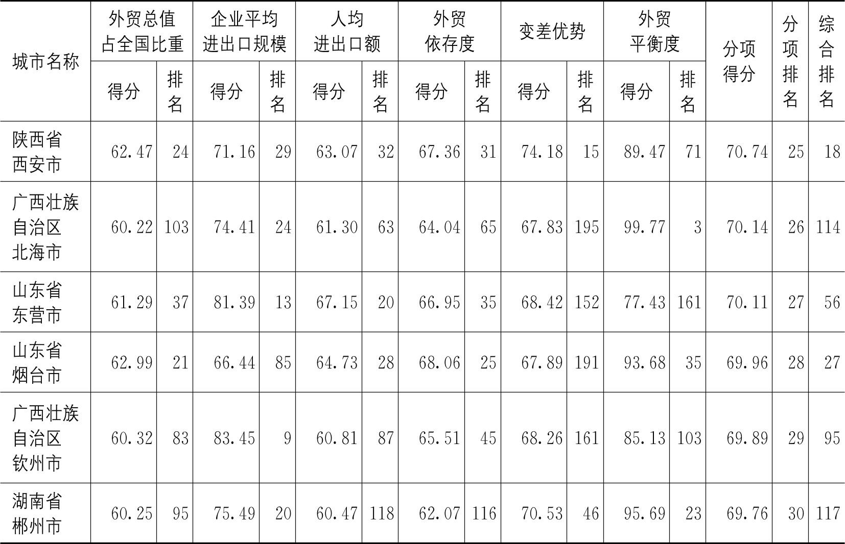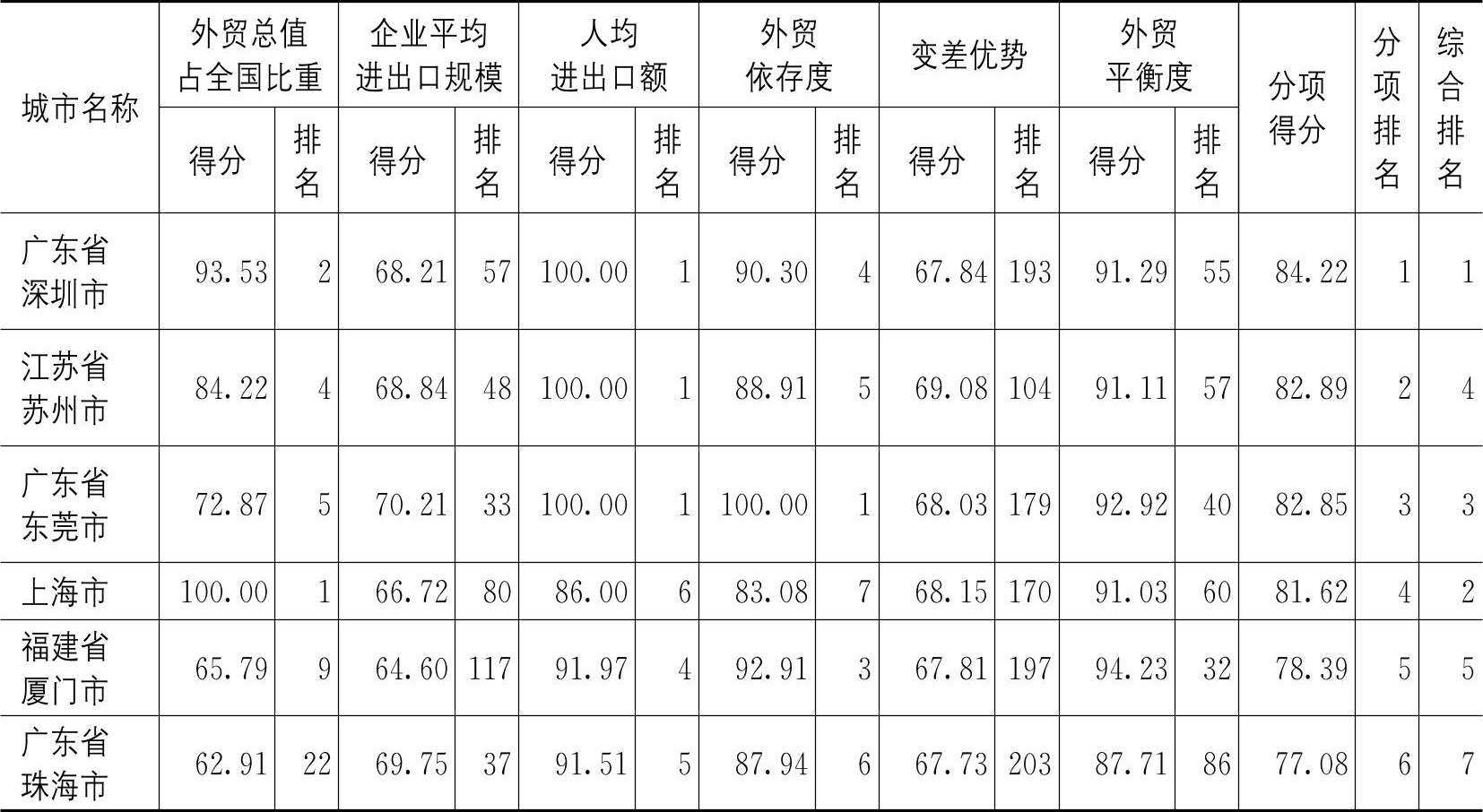 表4 2017年中国城市外贸水平竞争力30强排名表