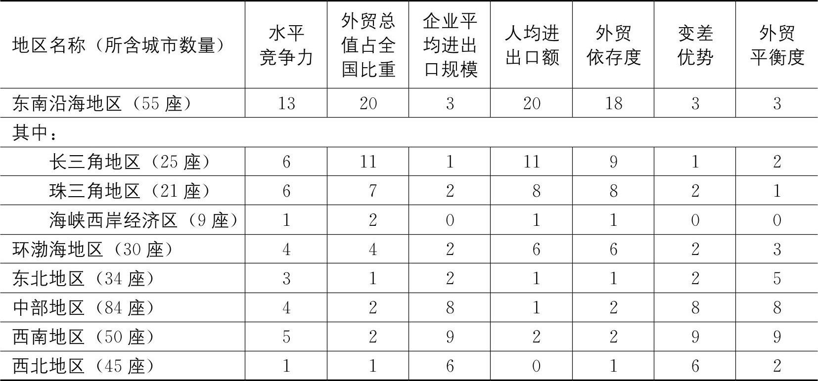 表5 2017年各地区水平竞争力单项指标进入前30名的城市分布表 单位:座