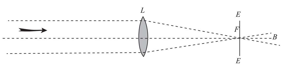 如果我们对现代望远镜制作原理做一个简短的说明,就可以更好地理解伽利略望远镜的改进。每一种这类仪器的性能都取决于通过透镜或凹面镜在它的焦点上形成遥远物体的图像的能力。对于透镜来说,这是通过折射穿过它的光来实现的;对于镜子来说,这是通过反射照射到它的光线来实现的。为了形成一个点的图像,必须收集并使从该点发出的一部分光线会聚到另一点。例如,在下图中,远处的一个点沿箭头方向发出的几乎平行的光线撞击透镜L,当它们穿过透镜L时,它们的路径发生弯曲,偏离它们原来的方向,会聚到点F。光线继续它们的路径,从F点处散开,就好像F点本身是一个发光点一样,在F点处会形成一个以其为顶点的光的圆锥体。一个观察者把他的眼睛放在这个光线圆锥体内,看着F点,在那他会看到一个发光点,尽管实际上那里什么也没有。用天文学的术语来说,这个视觉上的亮点被称为真实点的图像。这个OF的距离,被称为透镜的焦距。