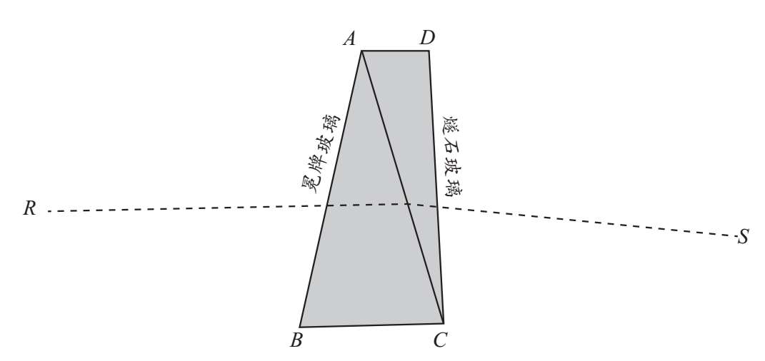 从伽利略将他的第一架望远镜展示给威尼斯当局的那一刻起,经过了一个半世纪,才发现了消除透镜色差的方法。虽然消色差望远镜的原理是由德国数学家欧拉首次发表的,但它的实际构造还是要归功于多朗德,一位英国眼镜商。多朗德的发明是将两种玻璃的凸凹透镜组合在一起,使其像差相互抵消。这个透镜组合是如何起作用的,可以通过一个棱镜的折射情况得到最好的展示,在这里同样的原理会起作用。将光分离成它的棱镜颜色在这里被称为色散。现在假设我们取两个玻璃棱镜ABC和ACD(图16),并按照图中所示的方式连接它们。如果一条光线RS穿过这两条棱镜,它们在光线上的作用会由于它们的角度转向的相反方向而趋向于相互抵消,光线只会因折射率的差异折射,并因分散率的差异分散。如果分散率相等,则根本就没有分散,光线通过时没有任何颜色的分离。如果这两个棱镜是由同一种玻璃制成的,只有使它们具有相同的角度,才能使它们的分散率相等,那么它们的折射率也将相等,光线将不经任何折射而通过。因为我们的目标是在不分散的情况下进行折射,所以同一种玻璃的棱镜组合不能产生这个效果。