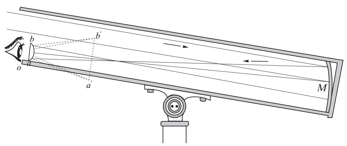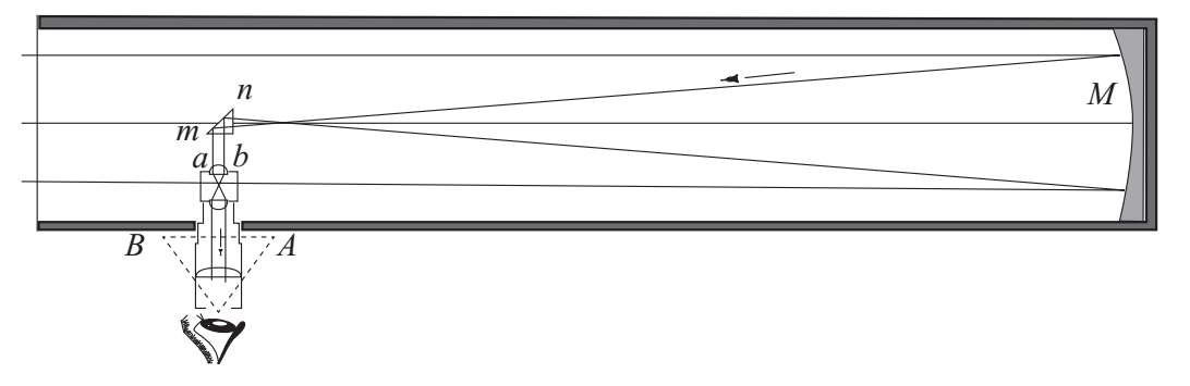 图22:牛顿望远镜的水平部分。这个部分展示了光如何从抛物面镜M反射出来,遇到一个小的矩形棱镜mn,它取代了旧版牛顿望远镜中使用的倾斜的平面镜。经过mn的全反射后,光线在ab处形成一个非常小的天体图像。