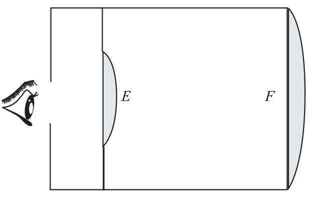 如果现在我们有一个有一定视觉大小的物体,而不是一个简单的点,比如月亮、房子或树,那么这个物体上的所有的点发出的光线都将被带到F点附近的一个相应点。为了找到这个对应点的位置,我们只需要从物体上的每个点画一条线,穿过镜片的中心,继续画到聚焦点处。这样,物体的每个点在图像中都有自己的对应点。这些点或图像将分布在被称为焦平面的表面EFE上,并将以小比例但相反的位置构成整个物体的表象或图像,与摄影师的相机完全相同。然后,在光线圆锥体内的B点上的一只眼睛将看到物体在焦平面上的全部或部分倒转图像。这样形成的图像可以被眼睛视为一个真实的物体;因为一个微小的物体可以通过放大镜得到观察,因此这样一个透镜可以用来观察和放大在焦平面上形成的图像。在长焦距的大透镜中形成焦平面上的图像,而小透镜则用来观察和放大这幅图像,这样我们就有了折射望远镜的两个基本部分。前者称为物镜,后者称为目镜。