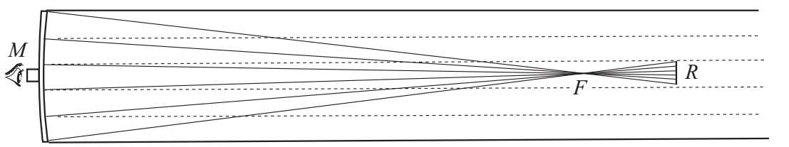 格里高利望远镜——这是詹姆斯·格里高利提出的一种设计。他可能早于牛顿发明了反射望远镜。在焦点F后面,放置了一个小凹面R,它可以使光线反射回管内。较大的镜子M在中间有一个开口,小镜子R经过调整在开口处对物体形成第二个图像。这个图像可由开口处拧入的一个目镜观看到。