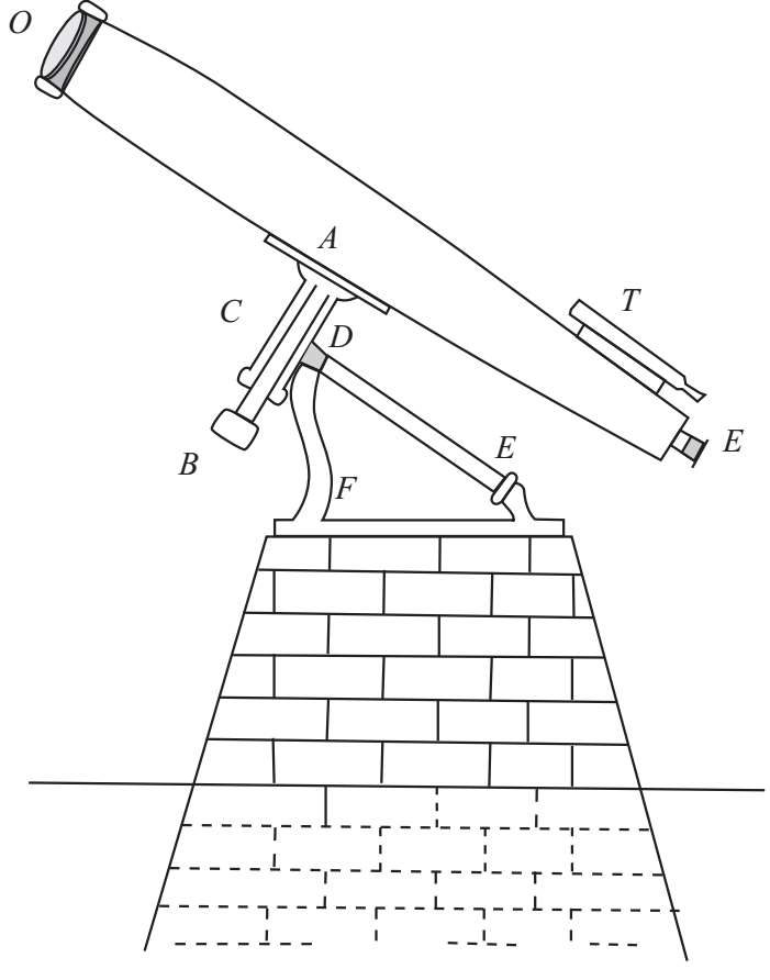 如果地球不旋转,那么每一个天体每天都能在几乎相同的方向被看到,使用大型望远镜的问题就会简化很多。物镜和目镜可以被固定起来以指向物体,观察者可以在他闲暇的时候仔细观测。但实际上,当我们使用望远镜时,地球的周日运动显然与仪器的放大倍数成比例增长;如果仪器是固定的,并且使用的是大倍数的,那么观测物体通过时速度就会很快,观察者无法观测到。仅仅是把望远镜指向需要的物体就需要许多特殊的发明,因为,除非指向准确,否则根本找不到观测对象。如果仅用望远镜,而不用其他辅助设备,观察者可能花半个小时也不能把望远镜精确地指向天狼星,不能将这个星星的图像放入望远镜视野里;然后,在他好好看一眼之前,天狼星可能会从视野里飞走而使观测对象再次丢失。如果上述所说的情况是一颗明亮的星星,那么找到海王星,一颗肉眼看不到的星星,在同一方向上不会保持连续两分钟的,得有多么困难!我们很容易理解,任何大望远镜的天文学使用,必须做好两件事:首先,将望远镜指向任何可见或不可见的物体的方法;第二,移动望远镜,使它跟随目标的周日运动的方法,这样观测目标才能一直处于观测视野中。以下是这些目标怎么生效的机械发明:物镜被放置在一根长管OE的一端,这根长管OE的长度与观测目标的聚焦长度差不多相同。目镜安装在这根长管较低的那端E端。这根长管的目的是让镜片处于相对合适的位置,并保护观测者的眼睛免于杂散光干扰。