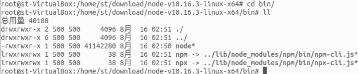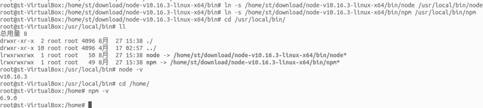 ln -s /home/st/download/node-v10.16.3-linux-x64/bin/npm /usr/local/bin/
