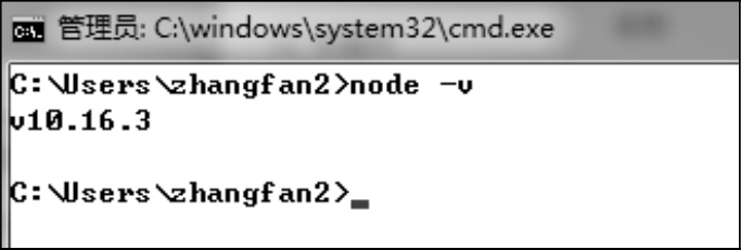 (8)在命令行窗口中输入node –v命令,如果显示正确的Node.js版本号,而非提示“不是内部或外部命令,也不是可运行的程序或批处理文件”,则说明Node.js安装成功,如图2-8所示。