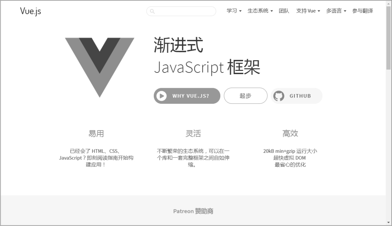与其他大型框架不同的是,Vue.js被设计为自底向上逐层应用。Vue.js的核心库只关注视图层,方便与第三方库或既有项目整合,非常容易学习。Vue.js的官方主页为https://cn.vuejs.org/,如图2-22所示。