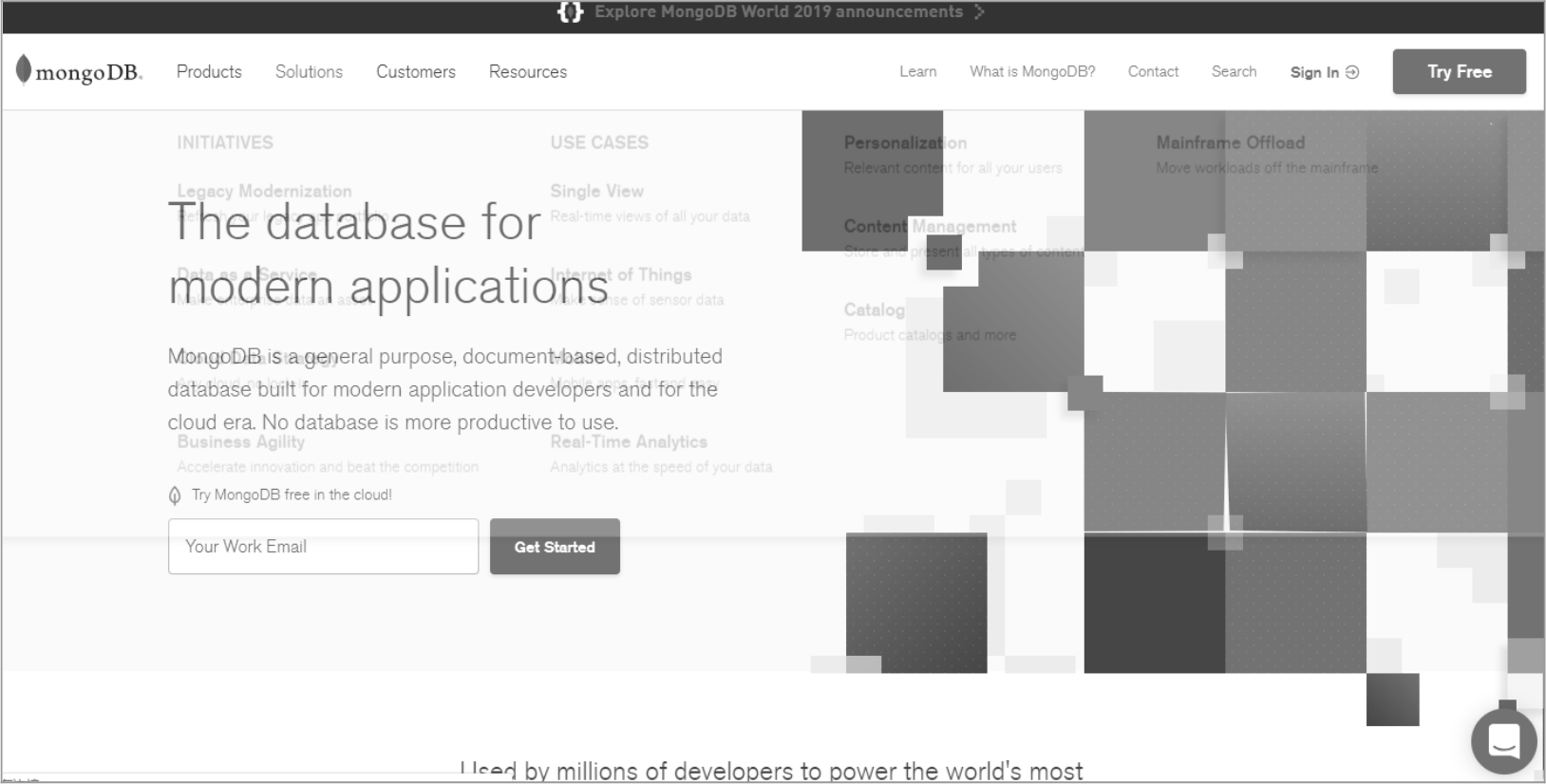 MongoDB使用BSON结构(Binary JSON)存储数据,是一种类似于JSON的存储格式。它的官网地址为https://www.mongodb.com/,其主页如图3-3所示。