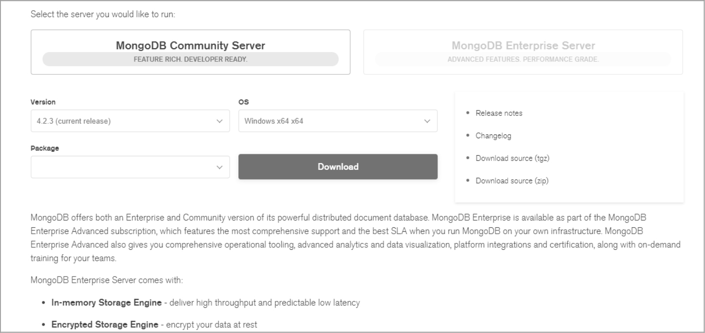 (1)在MongoDB官网下载Windows版本的安装包,地址为https://mongodb.com/download-center/community?jmp=docs。选择相应的操作系统和MongoDB,单击图3-5中的Download按钮,浏览器会自动下载MongoDB对应的安装包。