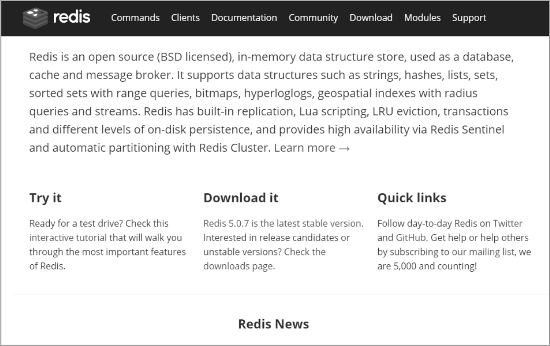 (1)Redis官网地址为https://redis.io/,如图3-10所示,单击Download it按钮下载最新版本的Redis安装包。
