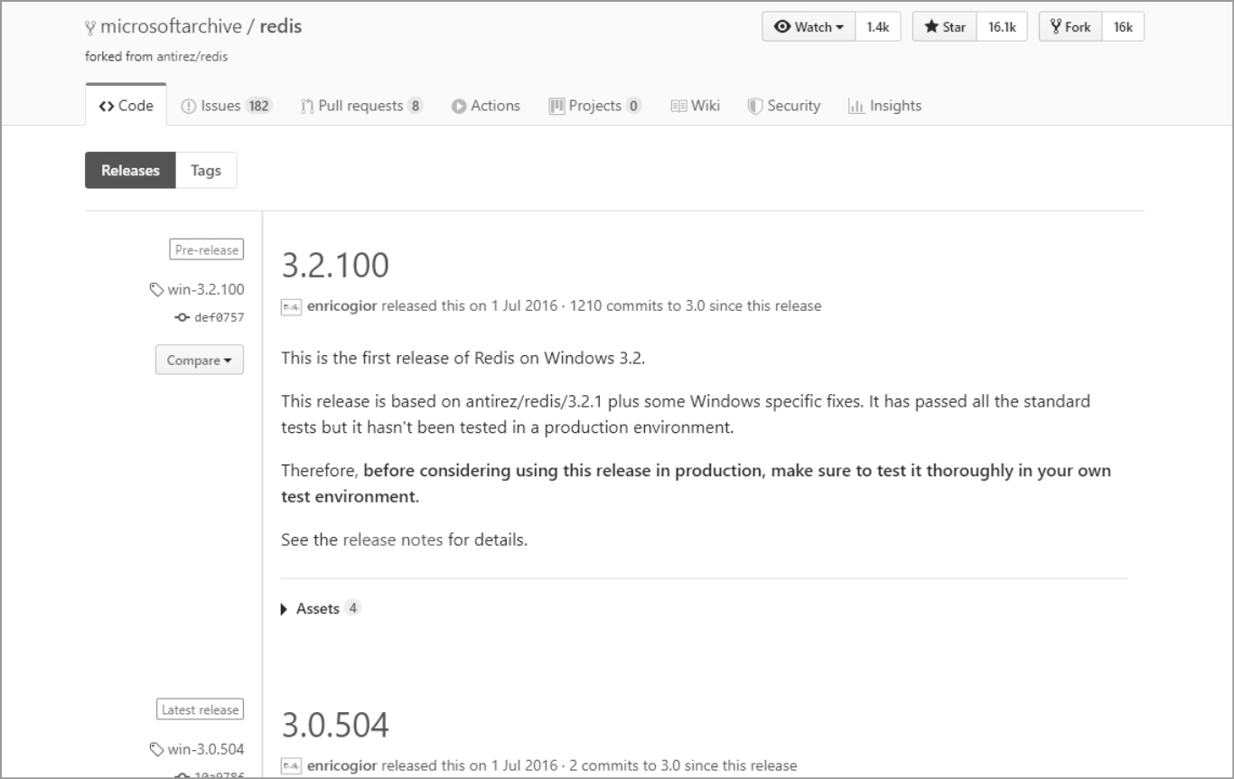 微软为了让众多开发者可以在Windows平台使用Redis,开发了Redis的Windows版本,并开源在GitHub中,网址为https://github.com/MicrosoftArchive/redis。该版本的问题在于更新缓慢,如今最新的Releases版本依旧是2016年发布的3.2.1版本,可以在其发布的版本分支中下载相关的程序,网址为https://github.com/MicrosoftArchive/redis/releases,如图3-11所示。