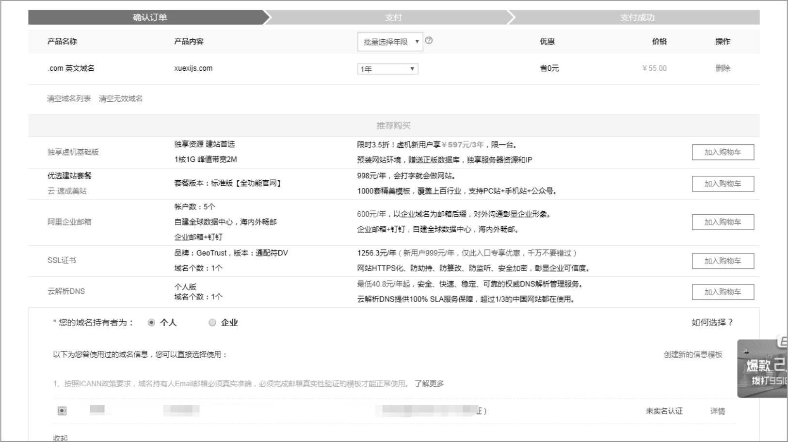 (4)如果喜欢的域名没有被占用,单击“加入清单”按钮,然后再单击右侧的“立即结算”按钮,页面会跳转至结算页面。在该页面调整购买年限,即可像淘宝一样使用支付宝付款,但是这一步需要选择该域名是由企业还是个人持有,如图1-9所示。