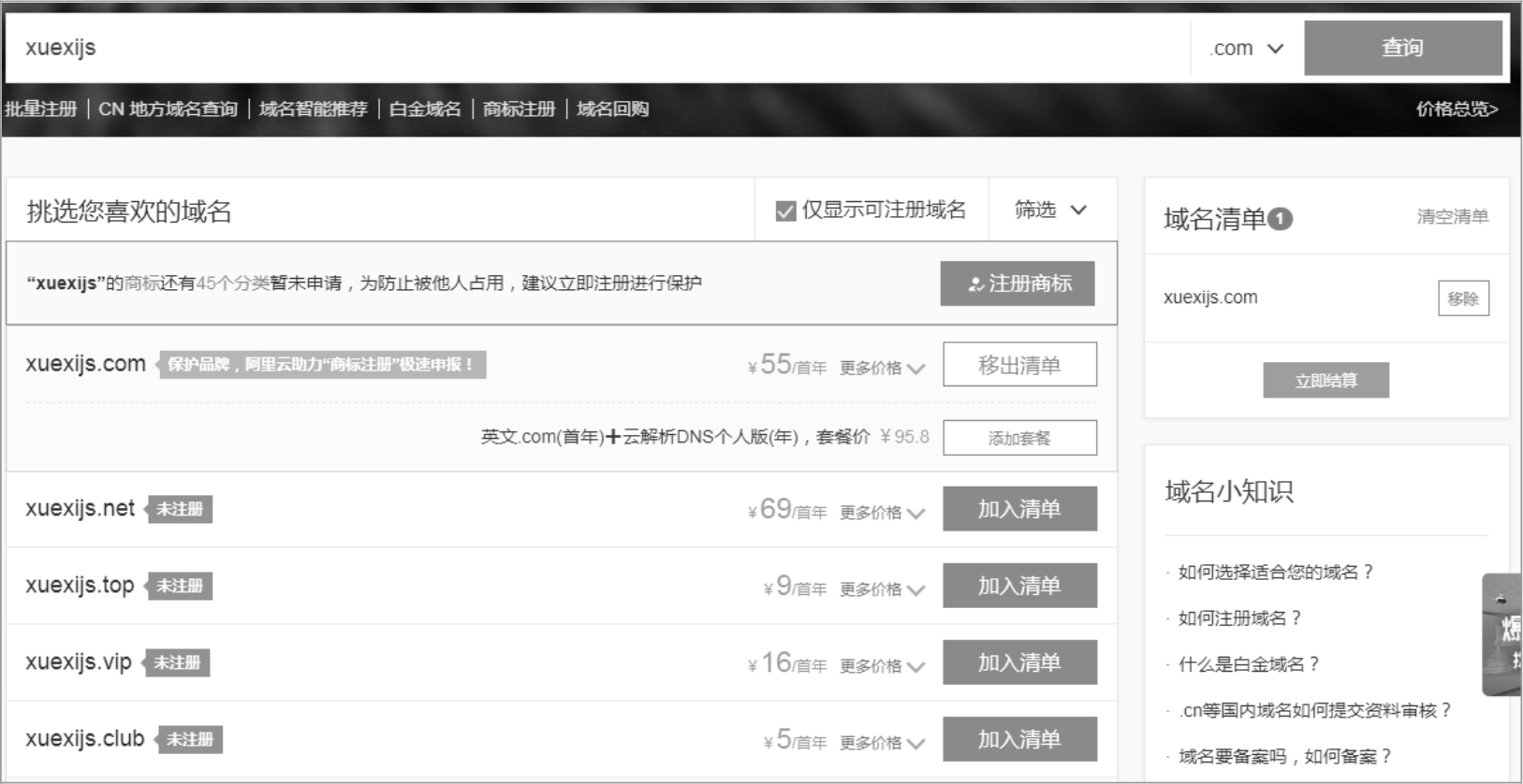 (3)此时映入眼帘的是一个搜索页面,输入想要购买的域名,因为域名在世界范围内都是唯一的,所以并不是所有的域名都可以直接购买。例如,此时搜索xuexijs,可以看到其被占用的情况,如图1-8所示。