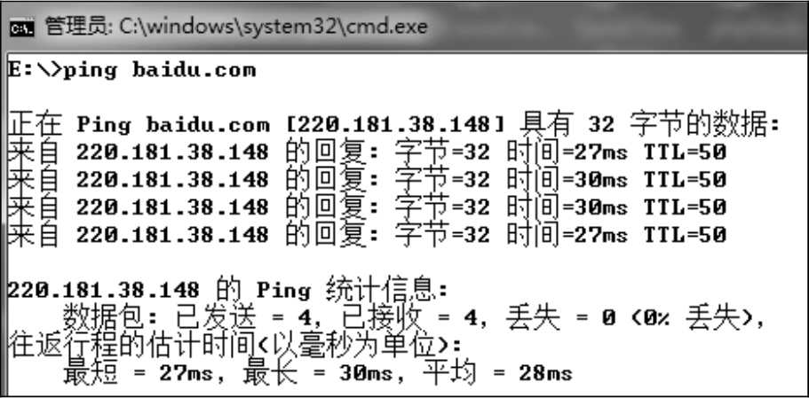 注意: 因为某些网站关闭了主机的ping功能或防火墙禁用了该端口,所以在命令行窗口中的测试结果(如果能ping通,则返回类似于图1-5所示的数据,如果ping不通,则返回类似于Time Out的提示)并不代表服务器当前的状态。