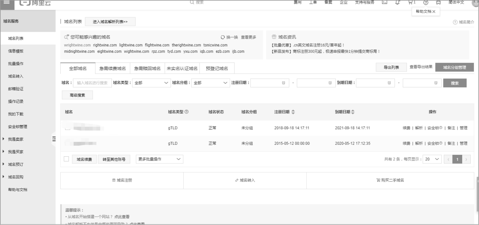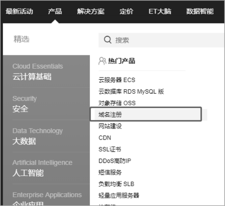 本节就以阿里云为例介绍如何购买域名。