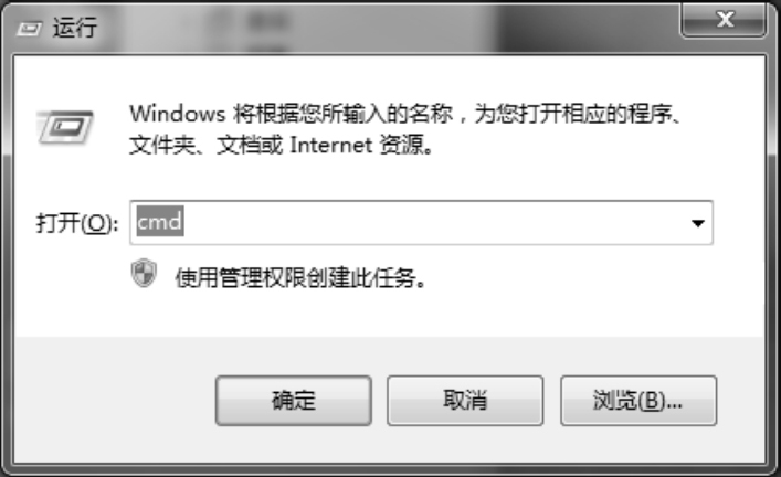 可以通过简单的命令行查看域名转发到真实主机中的服务器IP地址。下面查看baidu.com域名的真实IP地址。在Windows系统中按快捷键Win+R,弹出“运行”对话框,输入cmd,如图1-4所示。