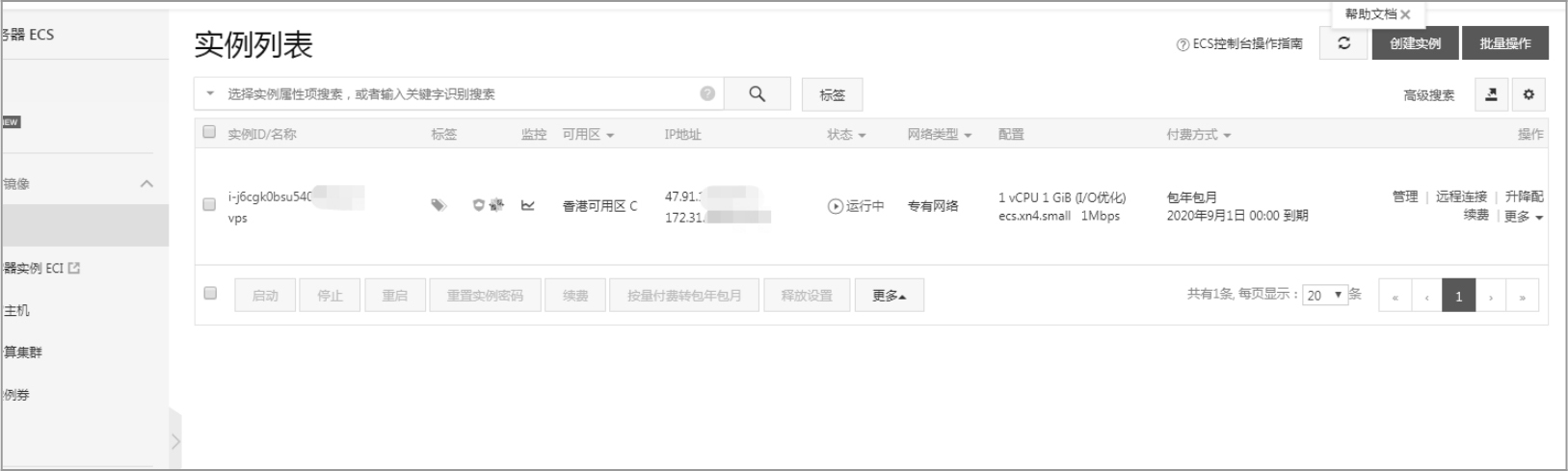 在阿里云上登录账户后,可以在管理页面看到购买的服务器、相关的IP地址和参数等,如图1-14所示。