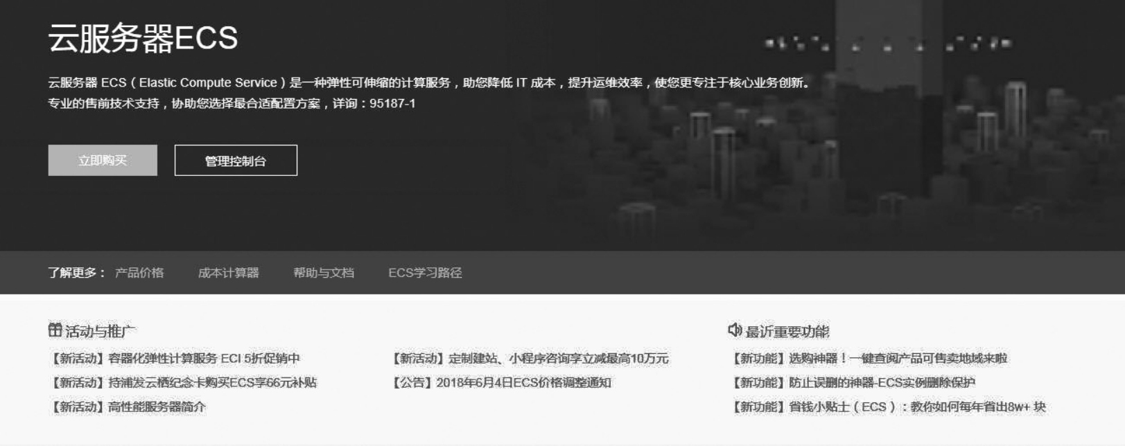 ·ECS云服务器:这种服务器相当于购买了一台计算机,其主页位于https://www.aliyun.com/product/ecs,提供了不同型号和性能的服务器,如图1-13所示。ECS云服务器没有键盘或显示器,在阿里云的机房中是虚拟化的服务器,但是它拥有独立的IP和存储,通过远程方式进行连接,通过命令来实现操作。