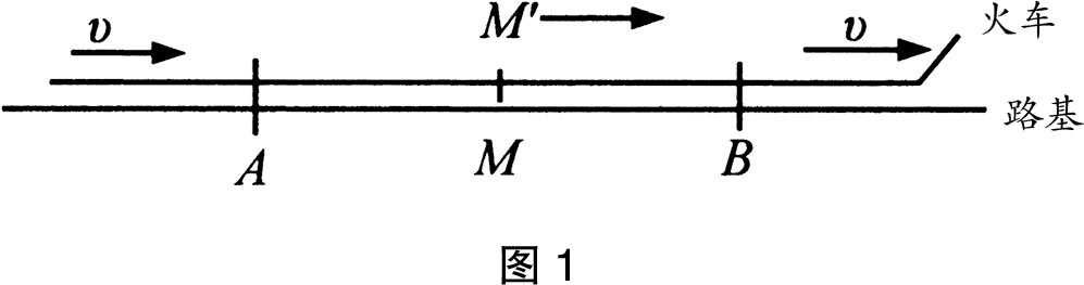 对于铁路路基来说是同时的两起事件(例如A、B两点的雷击),对于火车来说是否也是同时的呢?我们将直接证明答案必然是否定的。