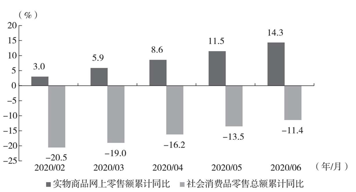 疫情期间,线下实体经济加速向线上转移,新业态新模式借力实现快速腾跃,数字经济逆势呈现爆发式增长态势。2020年上半年,在全国社会消费品零售总额下滑的同时,实物商品网上零售额达到43481亿元,同比增长14.3%(见图1.4);与互联网经济密切相关的快递行业保持强劲增势,全国快递业务量完成338.8亿件,同比增长22.05%,超过2016年全年水平。数字经济的快速发展激励更多线下经济主体大力提升线上化、数字化、智能化服务能力,加速推进数字化转型,并深刻改变存量经济业态。