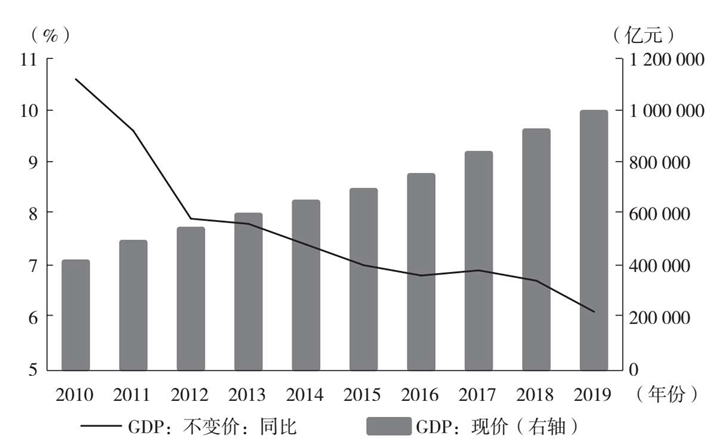 图1.1 2010—2019年中国GDP总量及增速同比变化