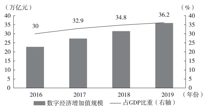 近年来,中国经济发展环境发生重大变化。国内方面,人口红利、城镇化等传统驱动因素对经济增长的边际贡献不断下降,传统的财政货币调控手段负面效应持续增加;国际方面,2008年全球金融危机余波尚未完全平息,逆全球化思潮又开始兴风作浪,贸易保护主义盛行,国际经贸、科技、教育往来出现波折,使全球产业链调整形势加剧。与此同时,经济发展不确定性因素的增多,加大了中国经济的下行压力。大数据、云计算、人工智能、区块链、物联网等新一代数字科技与实体经济的加速融合,带来新产业、新模式的无限可能,使数字经济得以蓬勃发展,为中国经济带来新的源头活水。同时,党和国家的支持政策、大步赶超的数字科技、完善的数字基础设施、超大规模的市场和丰富的人才资源等,为中国数字经济大步追赶甚至超越西方发达国家,创造出重要的时代机遇。数字经济将有效带动生产力提升和生产关系调整,助力中国经济质量变革、效率变革、动力变革,极大地改变中国传统经济版图,启动经济转型发展新引擎。
