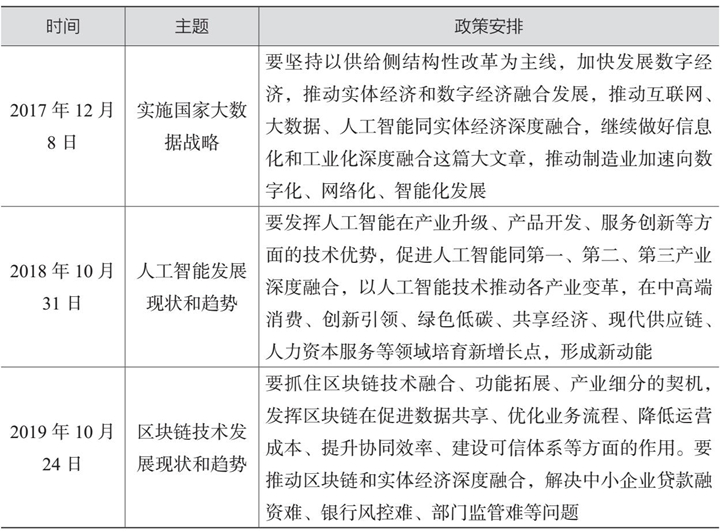 中央积极推动数字经济融入国家发展大局,大手笔擘画数字经济蓝图。2017年、2018年、2019年连续三年,中共中央政治局分别就大数据、人工智能和区块链等数字科技进行集体学习(见表1.1),对数字经济发展做出全局性安排,提出了一系列政策措施。