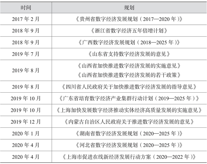 表1.4 近年来部分省(自治区、直辖市)出台的数字经济规划