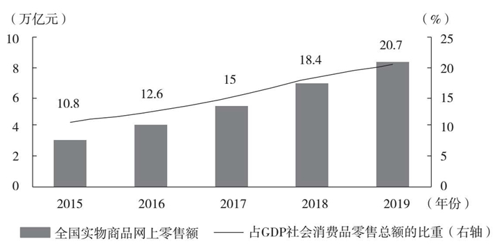 特别是在电子商务、数字支付、移动出行、网络游戏、智能城市等领域,中国有更多机会对发达国家实现弯道超车。电子商务作为中国数字经济的先行者,近年来始终保持着较高的增长速度。商务部《中国电子商务报告2019》显示,2019年全国电子商务交易额达34.81万亿元,其中实物商品网上零售额为8.52万亿元,占社会消费品零售总额的比重已上升到20.7%(见图1.3)。