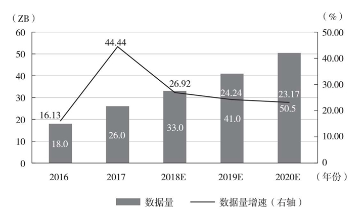 全球的数据量迅猛增长。中国信息通信研究院推测,2020年全球产生的数据量将达到50.5ZB(泽字节),同比增长约23%(见图3.1)。在数据量不断增长的推动下,大数据产业也将构建出多层多样的市场格局,因此具有广阔的发展空间。在2018—2020年,预测大数据市场整体的收入规模将保持每年约70亿美元的增长,全球大数据市场收入规模在2020年将达到560亿美元。未来两年里,大数据市场将呈现稳步发展的态势,增速保持在14%左右。另外,随着大数据市场成熟度的不断提高,在2025—2027年,市场规模的增长将有所放缓,维持约7%的增速。