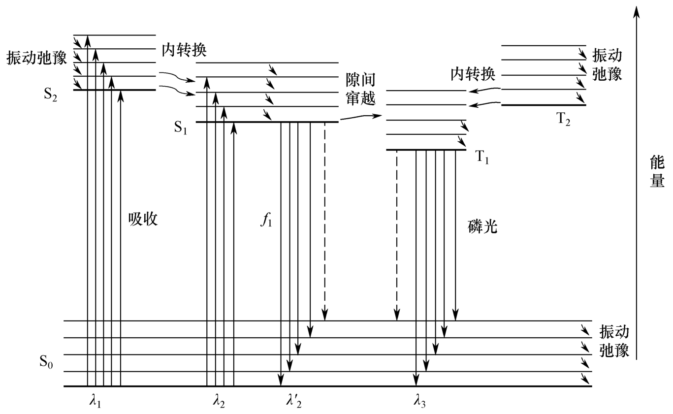(1)通过发光回到基态的过程,图中用 f 1 表示,这种从S 1 →S 0 的发光现象称为荧光,其进行速度是10 -5 ~10 -9 s。