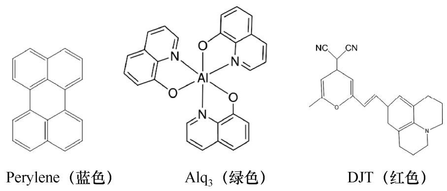 图3-3 3种常见的小分子蓝色、绿色和红色发光材料的分子结构