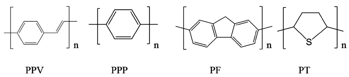 OLED(包括PLED)是双注入型器件,高效、平衡的载流子(空穴和电子)注入是实现高发光效率的前提,这就要求聚合物发光材料不仅要有良好的溶解及成膜性,还要有很好的载流子传输特性。而要使一种聚合物同时具有这些优良的光电特性和机械特性,就给材料合成带来了很大的困难。同时,聚合物的合成过程中的偶然性决定了其纯度和重复性难以保证,这也是制约聚合物OLED器件商业化应用的关键因素之一。在目前比较成熟的聚合物发光材料中,研究较多、性能较好的是聚苯撑乙烯(PPV)及其衍生物、聚芴(PF或PFO)及其衍生物和聚噻吩(PT)及其衍生物。除此之外,还有聚对苯(PPP)及其衍生物、聚咔唑(PCz)及其衍生物等。如图3-4所示是常见聚合物荧光发光材料的分子结构。