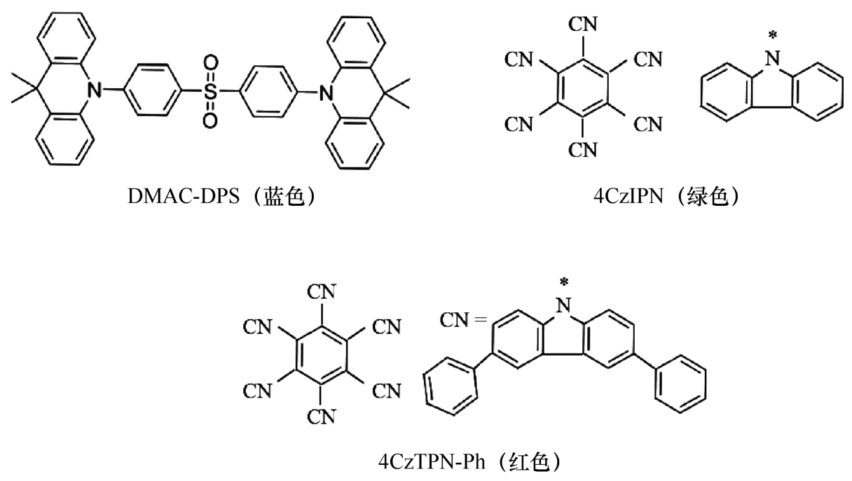 小分子延迟荧光发光材料被誉为继荧光发光材料和磷光发光材料后的第三代OLED发光材料。目前有两种方法用于获得延迟荧光,即三线态-三线态激子湮灭和热激发延迟荧光(Thermal Active Delay Fluorescent,TADF)。与三重态-三重态激子的湮灭相比,TADF具有更高的发光效率,因而备受瞩目。TADF是针对单重激发态和三重激发态能隙较小( Δ ST ≤100 meV)的材料,通过热激发产生充足的从三重激发态到单重激发态的ISC,将三线态激子转变为单线态激子。小分子延迟荧光发光材料能够充分利用三线态激子能量,打破了之前只有贵金属配合物磷光材料能有效利用自旋禁阻的三线态激子的僵局,大大降低了合成发光材料的成本,同时避免了磷光发光材料特别是蓝光材料在工作状态下的不稳定性。3种常见的小分子蓝色、绿色和红色发光材料的分子结构如图3-3所示。