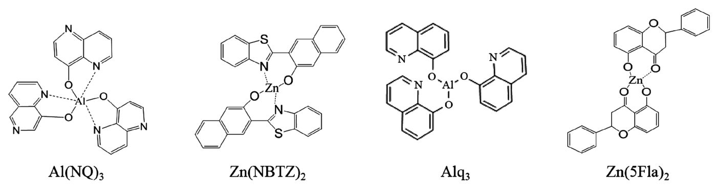 金属配合物的性质介于有机物和无机物之间,既拥有无机物良好的稳定性,又具备有机物的高量子效率,是目前被认为极具应用前景的发光功能材料之一。金属配合物电致发光材料分为电致荧光发光材料和电致磷光材料两类,比较常见的是前者。金属配合物电致荧光发光材料主要有:8-羟基喹啉配合物如Alq 3 及其衍生物、10-羟基苯并喹啉配合物、羟基苯并噻唑(噁唑)配合物、2-(2-羟基苯基)吡啶化合物、Schiff碱类金属配位化合物、羟基黄酮类配合物等。如图3-5所示为常见的金属配合物发光材料的分子结构。