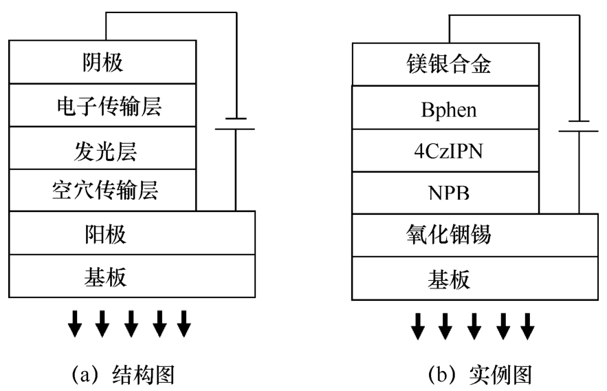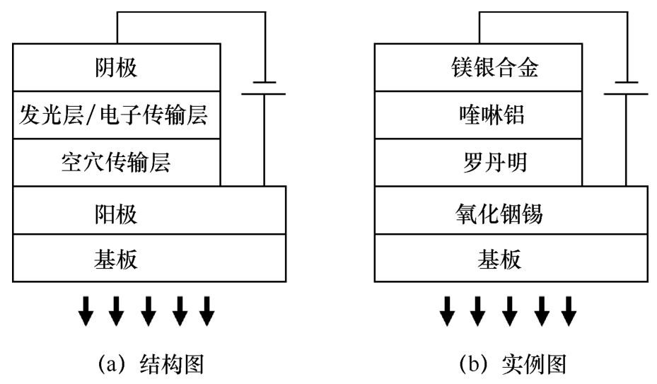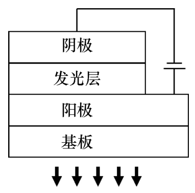 OLED效率和寿命与器件结构密切相关,目前广泛使用的结构属于“三明治夹层”结构,即发光层被阴极和阳极像三明治一样夹在中间(一侧为透明电极以便获得面发光效果)的结构。由于OLED制膜温度低,所以一般多使用氧化铟氧化锡玻璃电极(Indium Tin Oxide,ITO)作为阳极。在ITO电极上用真空蒸镀法或旋涂法制备单层或多层有机半导体薄膜,最后将金属阴极制备于有机薄膜之上。根据有机半导体薄膜的功能,器件结构大致可以分为以下几大类。