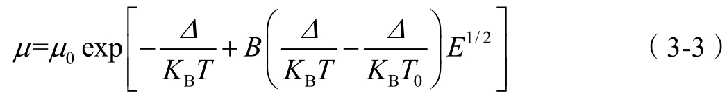 载流子迁移率是衡量有机薄膜载流子传输能力的重要指标之一。有机半导体材料的分子轨道交叠很少,其能带结构大多是局域化的不连续状态。有机半导体材料载流子迁移主要采用跳跃方式,其迁移率相对于具有连续能带结构的无机半导体材料要低很多。研究结果表明,在有机固态薄膜中,有机半导体材料迁移率与电场、温度的关系可用下式描述